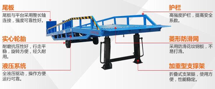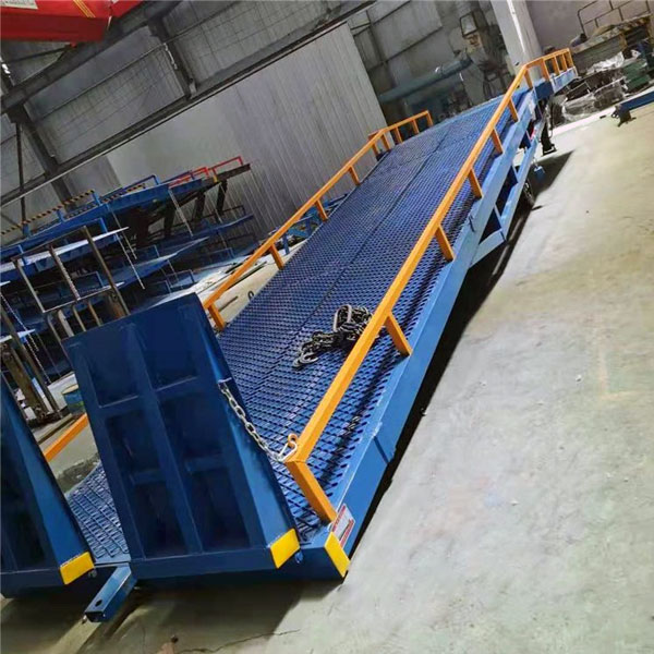 裝卸登車橋-移動式機械登車橋用于無裝卸設備的貨臺及流動裝卸場所,是與叉車配合使用的貨物裝卸輔助設備。借助移動式登車橋,叉車能直接駛?cè)肫嚰b箱內(nèi)部進行批量裝卸作業(yè)。只需單人操作,不需動力電源,即可實物的安全快速裝卸。