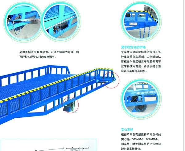 移動(dòng)式登車橋是與叉車配合使用的貨物裝卸輔助設(shè)備,可根據(jù)貨車車廂的高低調(diào)節(jié)高度,叉車可以直接通過本設(shè)備駛?cè)胲噹麅?nèi)部進(jìn)行貨物的批量裝卸,僅需單人作業(yè),即可實(shí)現(xiàn)貨物的快速裝卸。它的菱形網(wǎng)狀結(jié)構(gòu),充分保證了卓越的防滑性能,使叉車有極好的爬坡性和可操縱性。即使在雨、雪天氣,仍能保證正常使用。它的可調(diào)節(jié)長(zhǎng)度的索鏈能方便地鉤住貨車,使登車橋與貨車始終緊密貼合。采用手搖液壓泵作動(dòng)力,不需外接動(dòng)力電源即可輕松實(shí)現(xiàn)登車橋的高度調(diào)節(jié)。配置的剎車墊可有效防止貨車裝卸時(shí)登車橋移位。